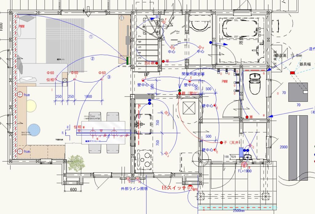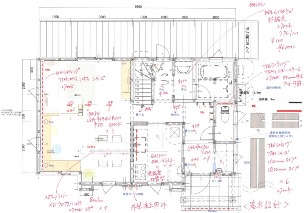 ※ 基本設計では、間接照明などの建築に絡むことが多いので、打ち合わせ時期は早ければ早いほど、建築側も施主側も計画段階の自由度が効く。着工後になると、電気配線やスイッチ計画の制約が徐々に多くなるため、変更には内装大工、電気工事、現場監督の共通認識を合わせる必要がある。